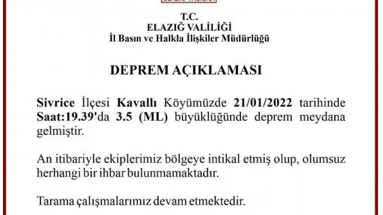 Elazığ Valiliği, meydana gelen 3.6 büyüklüğündeki deprem sonrası herhangi bir olumsuz ihbarın gelmediğini ve tarama işlemlerinin sürdürdüğünü bildirdi.
