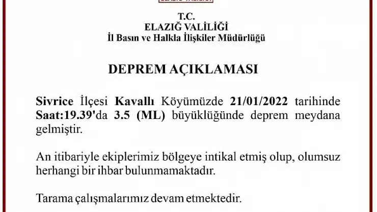 Deprem sonrası Elazığ Valiliğinden yapılan açıklamada, "An itibarıyla ekiplerimiz bölgeye intikal etmiş olup, olumsuz herhangi bir ihbar bulunmamaktadır. Tarama çalışmalarımız devam etmektedir" denildi.