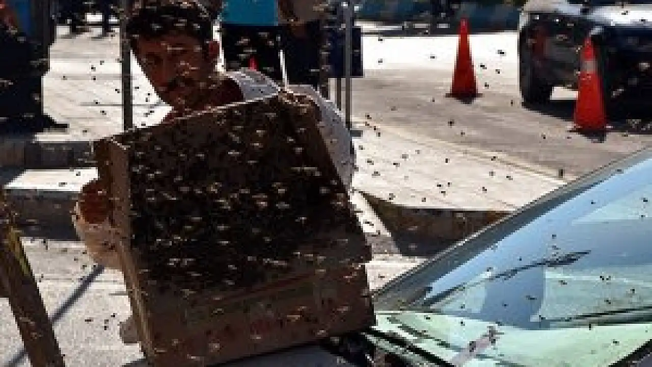 Kahramanmaraş'ın Elbistan ilçesinde kovanlarını terk eden arılar, en işlek caddeyi sardı.