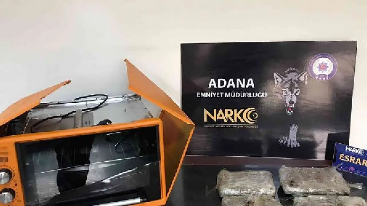 Adana polisi otobüsün bagajında elektrikli fırın içinde 1 kilo 632 gram esrar ele geçirdi.