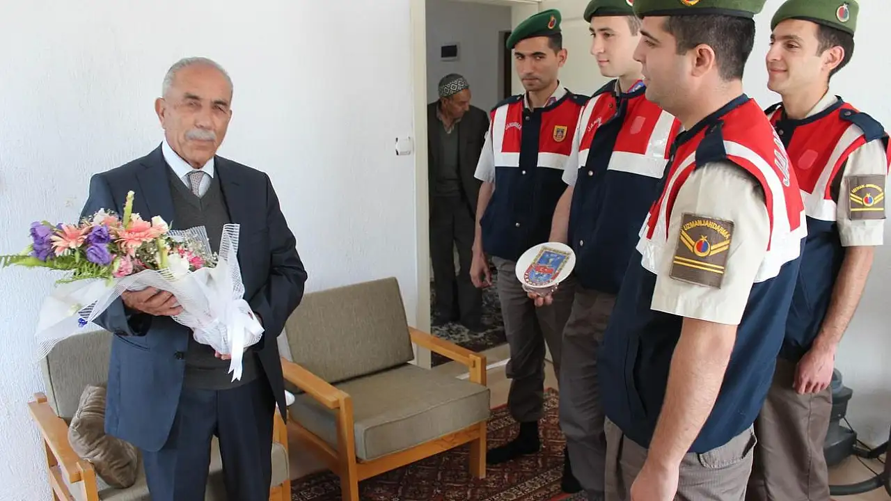 Konya'nın Beyşehir İlçesi'nde görev yapan uzman jandarmalar, ilçeye bağlı Dumanlı Mahallesi'nde yaşayan 45 yıl önce emekli olan 80 yaşındaki meslektaşlarını ziyaret ederek çiçek takdim etti.