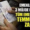 SSK, Bağ-Kur ve memur emeklileri ilk bin liralık bayram ikramiyelerini 7-8 Haziran'da cebine koydu. SSK ve Bağ-Kur emeklilerine Haziran'da maaşları da erken ödenerek, bayrama maaşlarıyla girme imkanı sağlandı. Emeklilere, Temmuz ayında da zam var. SSK ve Bağ-Kur emeklilerine bu yılın ilk 6 aylık döneminde gerçekleşen enflasyon kadar zam yapılacak. Memur emeklilerinin maaşlarına ise yüzde 3.5 zam + enflasyon farkı yansıtılacak. Zam oranları, 3 Temmuz'da belli olacak. SSK ve Bağ-Kur emeklileri, bu tarihlerde zamlarını öğrenip aylık ödeme günlerinde yeni maaşlarına kavuşacak. Memur emeklileri de ayın 1'i ile 5'i arasında maaşlarını alacak. Zam farkını ise daha sonradan Sosyal Güvenlik Kurumu'nun açıklayacağı tarihte cebine koyacak. emeklilerin ayrıca maaşlarıyla birlikte ek ödemeleri de artacak. Tüm emekliler her ay maaşlarının yüzde 4'ü, yüzde 5'i oranında ek ödeme alıyor. Temmuz'da maaşlar artacağı için ek ödeme de yükselecek..
