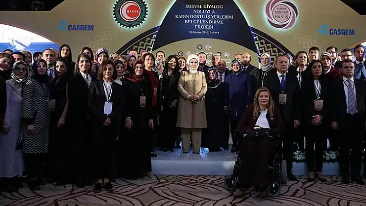 Cumhurbaşkanı Recep Tayyip Erdoğan'ın eşi Emine Erdoğan, Rixos Otel'de, Çalışma ve Sosyal Güvenlik Eğitim ve Araştırma Merkezi (ÇASGEM) ile HAK-İŞ Konfederasyonu ortaklığında yürütülen ''Sosyal Diyalog Yoluyla Kadın Dostu İş Yerlerini Belgelendirme Projesi''nin kapanış toplantısı, sertifika ve ödül törenine katıldı.