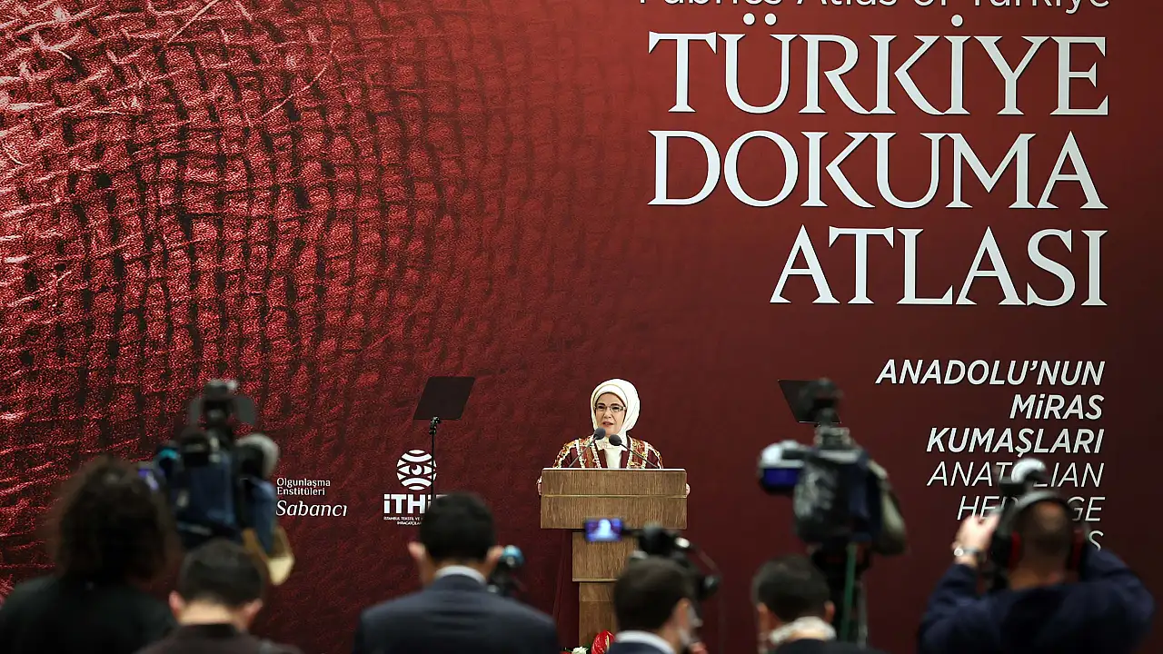 Emine Erdoğan, dokuma kültürünün, Türkiye'nin zengin kültürel ve coğrafi özelliklerini, aynı şekilde farklı desen ve motifleriyle, etnik ve etnografik birikimi yansıttığını belirtti. Anadolu dokumaları arasında yer alan Ankara Sofu, Edirne Kırmızısı, Hatay İpeği, Antep Kutnusu, Muğla Dastar dokumasının özelliklerine dikkati çeken Erdoğan, "Dokuma sanatı, alelade bir kumaş üreticiliği değil, insanın hayatla ve doğayla etkileşiminin aynasıdır. Doğum, düğün ve cenaze gibi hayatın dönüm noktaları motiflere yansır. Henüz kelimelere aktarılamamış nice duygu ve düşünce, nakışlarla tercüme edilir. Her ilmek içinde hüzün ve sevinç gibi hayatın tüm tonlarını taşır" ifadelerini kullandı. Her yörenin coğrafi deneyiminin ayrı bir sanat ve dil ortaya çıkardığına işaret eden Erdoğan, "Motiften kumaşa, kullanılan malzemeden tasarıma kadar, bu zanaat bütün olarak bir kimlikti. Bu yanıyla dokumacılık, geçmiş zamanların dünya tasavvurunun birer broşürü ve engin bir tarih kaynağıdır. Türkiye Dokuma Atlası, Anadolu zevkiseliminin izlerini ortaya çıkarmaktadır. Ancak bu çaba geçmişi sevmek, tarihi eserlere övgüden öte bir çabadır. Dokumalarımızı yaşatmak, onları çağdaş tasarımlarla buluşturmak gayretidir" dedi.