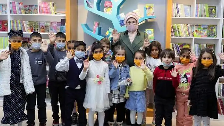 Okulda çocuklar ve okul müdürü Eylem Çelik tarafından çiçeklerle karşılanan Emine Erdoğan ve beraberindekiler, Milli Eğitim Bakanlığı ile Kültür ve Turizm Bakanlığınca başlatılan "Kütüphanesiz Okul Kalmasın" projesi kapsamında okulda kurulan kütüphanenin açılışını yaptı.