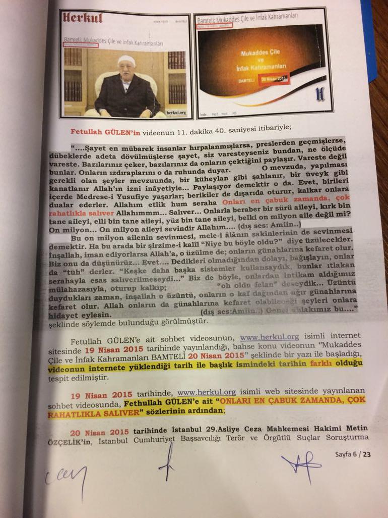 19 Nisan 2015 tarihli Fetullah Gülen imzası taşıyan asliye ceza hakimlerine hitaben yazılan belgede, Selam Tevhid ve Tahşiye kumpası operasyonu kapsamında tutuklu olan aralarında Samanyolu Grup Başkanı Hidayet Karaca ve üst düzey polis şeflerinin tahliyesini istiyor.En büyük delil ele geçti