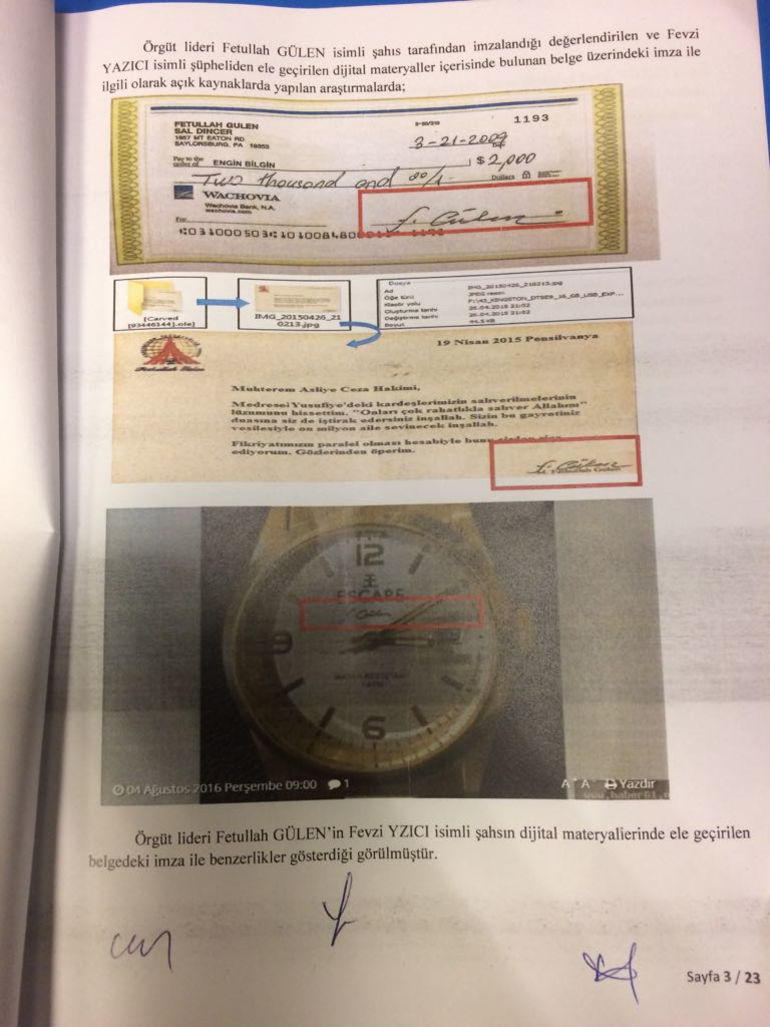Belgedeki imzayı inceleyen İstanbul Başsavcılığı, talimat belgesindeki imzanın çek ve saatte bulunan imzalarla aynı olduğunu, dolayısıyla bu imzanın Gülen’e ait olduğunu belirtti.