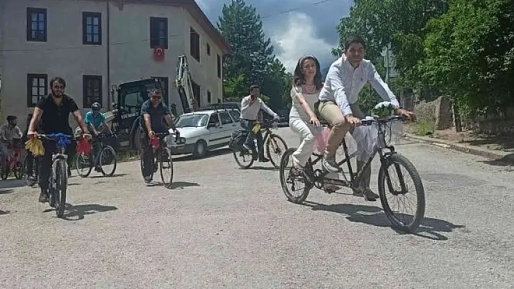 Gazetecilere konuşan damat Emre Yılmaz, yıllardır bisiklet kullanıcısı olduklarını belirterek, "Gönlümüzü verdik bu işe. Bu güzel günümüze bisikleti de katmak istedik. Çevreci olduğu için herkesi bisiklet binmeye davet ederiz" dedi.