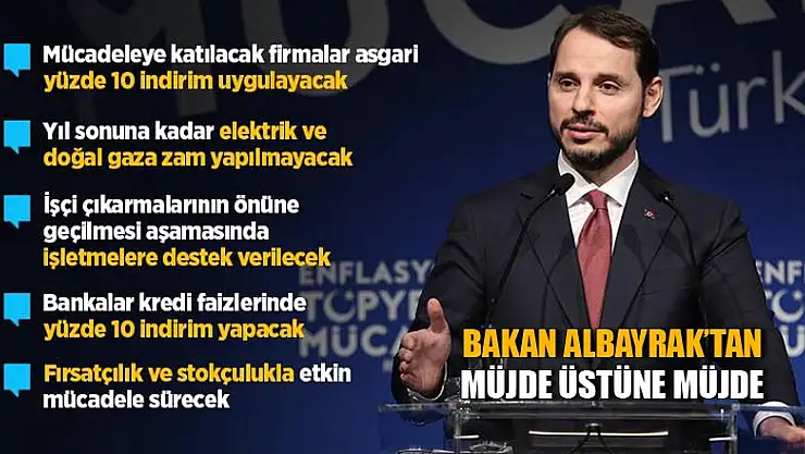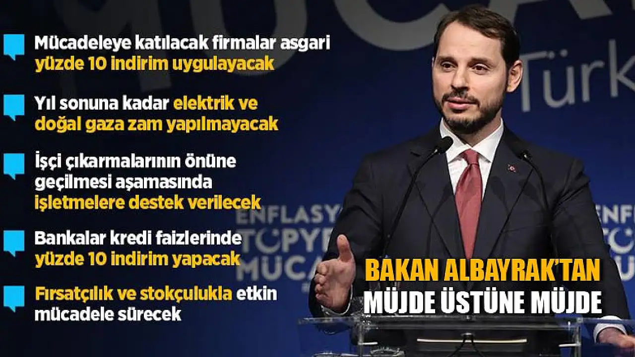 Hazine ve Maliye Bakanı Berat Albayrak, İstanbul Kongre Merkezi'nde düzenlenen toplantıda Enflasyonla Topyekun Mücadele Programı'nı açıkladı. Albayrak, "Tüm firmalarımızdan asgari yüzde 10 indirim yapmaları ve bu indirimi yıl sonuna kadar sürdürmeleri konusunda mutabık kaldık" dedi. Albayrak konuşmasında yıl sonuna kadar doğalgaz ve elektriğe zam yapılmayacağı müjdesini de verdi. Bakan Albayrak, "1 Ağustos'tan geçerli olmak üzere bankalarımız yüksek faizle kullandırılan kredilerin faiz oranlarında yüzde 10 indirim yapacaklarını belirttiler" ifadelerini sözlerine ekledi.