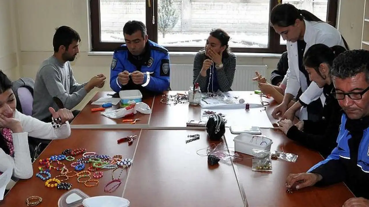 Kayseri'de 15 engelli genç, İl Emniyet Müdürlüğü Toplum Destekli Polislik Şube Müdürlüğünün, Çocuk ve Gençler Sosyal Koruma ve Destek Programı (ÇOGEP) kapsamında verdiği takı tasarım kursuyla iş engelini aşacak.
