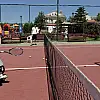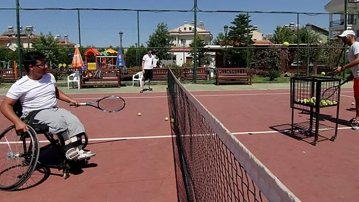 Muğla'nın Fethiye ilçesinde bedensel engelli sporculara tenis eğitimi veren Volkan Koyuncu, tekerlekli sandalyede oturarak antrenman yaptırıyor.