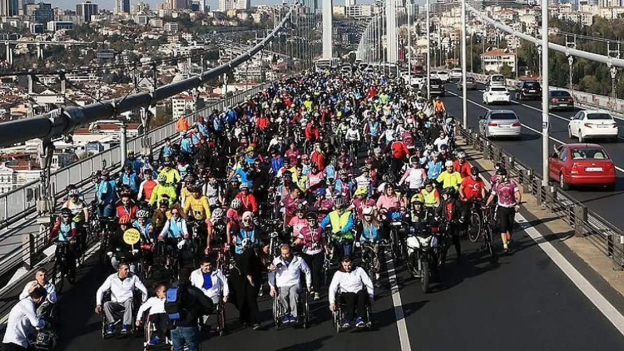 'Sessiz Çığlık Bisiklet Korteji' etkinliğinde engelliler oluşturdukları bisiklet kortejiyle 15 Temmuz Şehitler Köprüsü'nü kullanarak Avrupa kıtasından Asya'ya pedal çevirdi.