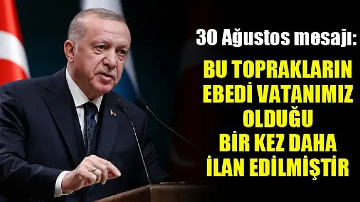 Cumhurbaşkanı Erdoğan, '30 Ağustos zaferiyle bu toprakların ezeli ve ebedi vatanımız olduğu tüm dünyaya bir kez daha ilan edilmiştir.' dedi.
