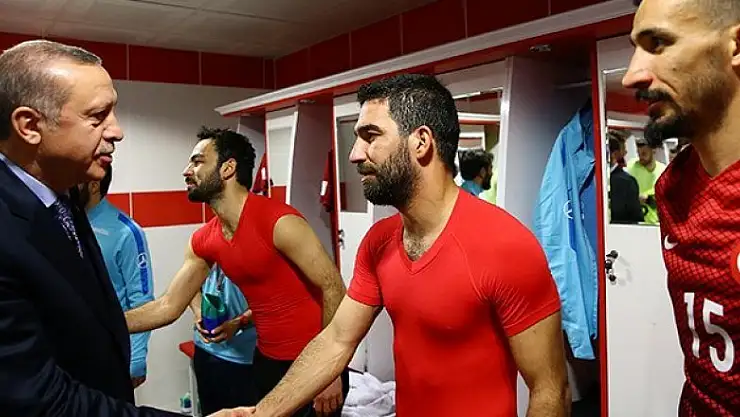 A Milli Futbol Takımı'nın soyunma odasını ziyaret eden Erdoğan'ı, soyunma odasının girişinde Türkiye Futbol Direktörü Fatih Terim karşıladı. Cumhurbaşkanı Erdoğan, burada futbolcularla tek tek tokalaşarak, başarı dileklerini ilettti.