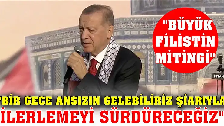 - Erdoğan, 'Büyük Filistin Mitingi'nde: 'Bir gece ansızın gelebiliriz şiarıyla kendi çizdiğimiz yolda ilerlemeyi sürdüreceğiz'
