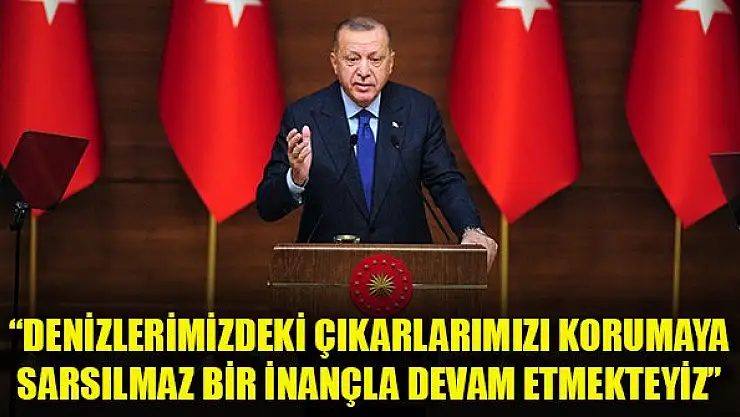 Cumhurbaşkanı Erdoğan, 'Denizlerimizdeki hak ve çıkarlarımızı korumaya güçlü bir irade ve sarsılmaz bir inançla devam etmekteyiz.' dedi.