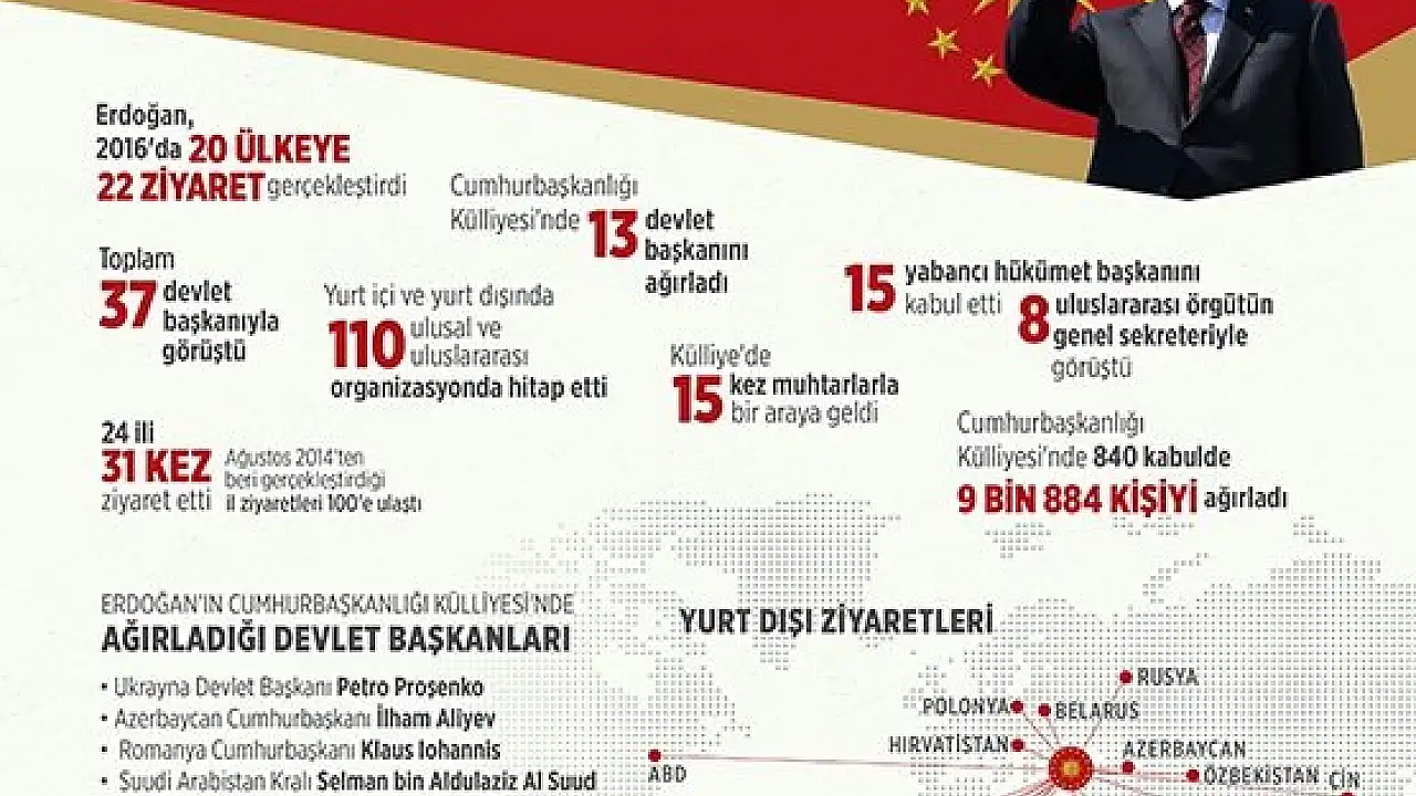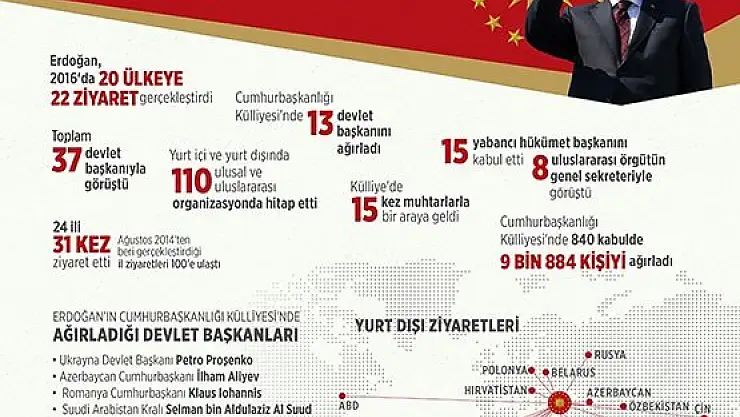 Cumhurbaşkanı Erdoğan, 2016'da 20 ülkeye, 22 ziyaret yaptı. Bu ziyaretler kapsamında Erdoğan, toplam 146 bin 704 kilometre yol yaparak, dünyanın etrafını yaklaşık 4 kez dolaştı.