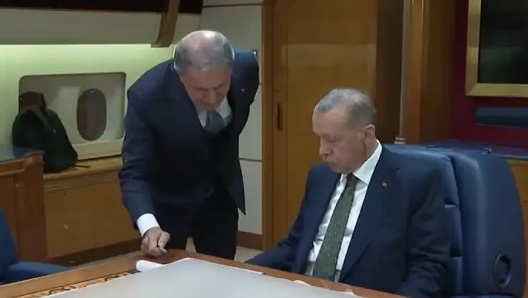 Pençe Kılıç Harekatı'nın başlatıldığı ana dair görüntüler paylaşıldı. Başkan Recep Tayyip Erdoğan'ın incelediği operasyon detaylarına onay vererek Milli Savunma Bakanı Hulusi Akar'ı talimatlandırdığı anlar kameralara böyle yansıdı.