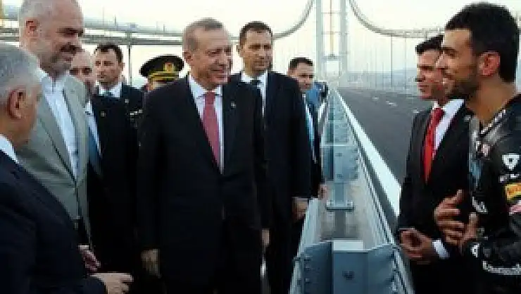 Köprünün açılışının ardından Cumhurbaşkanı Erdoğan direksiyonun başına geçerek makam aracını kullandı. Erdoğan’ı köprünün ortasında milli motosikletçi Kenan Sofuoğlu karşıladı.