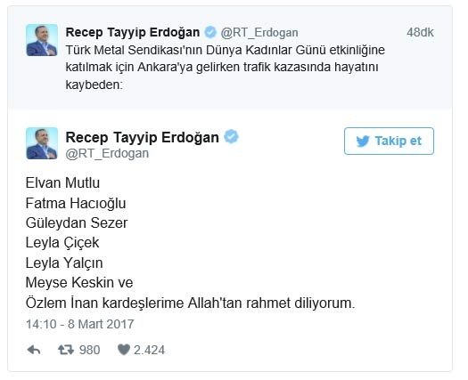 Cumhurbaşkanı Recep Tayyip Erdoğan, trafik kazasında hayatını kaybeden Türk Metal Sendikası üyesi 7 kadın için Twitter'da başsağlığı diledi.