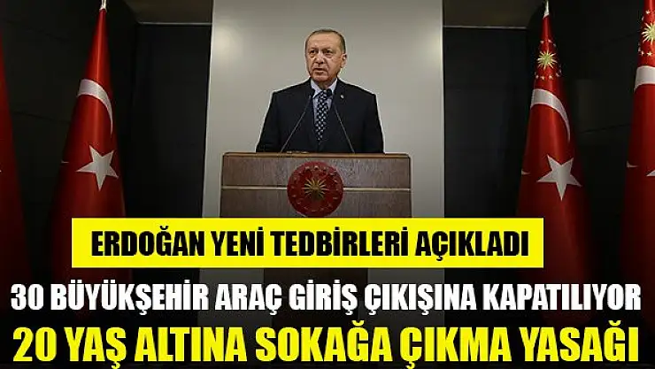 Bir başka tedbire işaret eden Erdoğan, "Ülkemizin tamamında daha önce 65 yaş üzerine uyguladığımız sokağa çıkma kısıtlamasını 20 yaş altı için de getirmektir. Gece yarısından itibaren 1 Ocak 2000 ve üstü tarihli doğumlular da tıpkı 65 yaş üstü gibi sokağa çıkamayacaktır. Bununla gençlerimizi de çocuklarımızı da ciddi manada kontrol altına, karantina altına almak durumundayız. Yani '65 yaş üstü sıkıntıda da 20 yaş altı sıkıntıda değil' diye elimizde böyle bir garanti yok." diye konuştu.