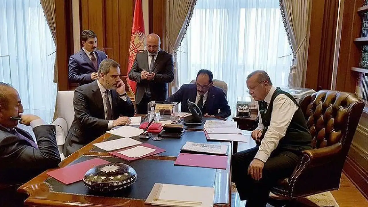 La photo montre qu'Erdogan a tenu l'entretien dans son bureau au palais présidentiel, accompagné du ministre des Affaires étrangères, Mevlut Cavusoglu, du chef des Renseignements turcs, Hakan Fidan, du porte-parole de la Présidence, Ibrahim Kalin, du Conseilleur en chef à la Présidence, Hamdi Kilic, et du chef de Cabinet de la Présidence, Hasan Dogan.