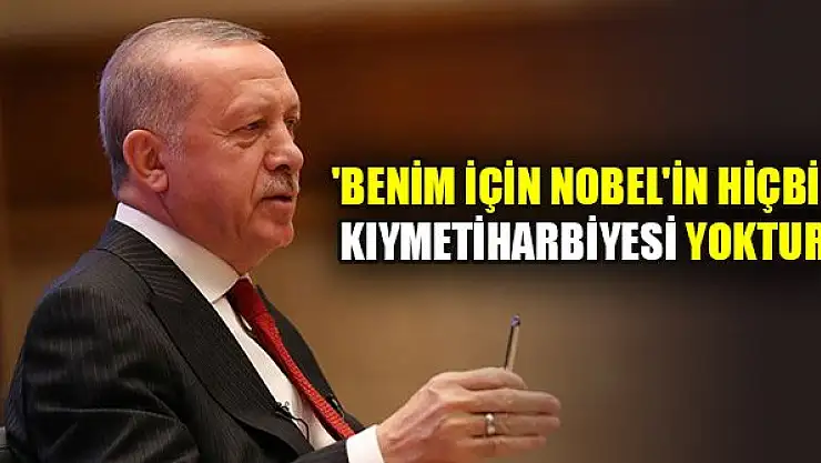 Cumhurbaşkanı Erdoğan, 'Nobel kendini tüketmiştir. Nobel, siyasi, ideolojik davranan bir kuruluş konumundadır. Benim için Nobel'in hiçbir kıymetiharbiyesi yoktur.' dedi.