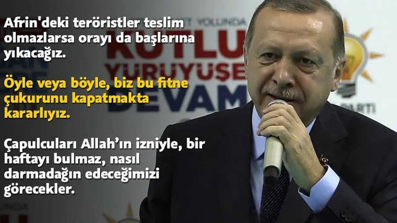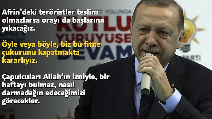 Cumhurbaşkanı Recep Tayyip Erdoğan, "Afrin'de teröristler teslim olmazsa orayı başlarına yıkacağız. Münbiç'te bize verilen sözler yerine getirilmezse kendi göbeğimizi keseceğiz. Bir haftaya kalmaz ne yapacağımızı görecekler" dedi.