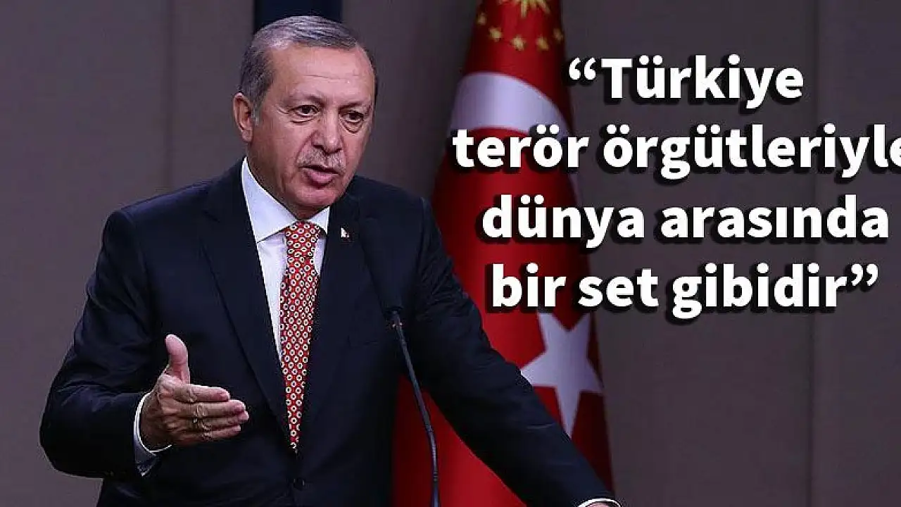 Cumhurbaşkanı Erdoğan, 'Türkiye, terör örgütleriyle dünyanın geri kalan bölümü arasında adeta bir set gibidir. Eğer bu set yıkılırsa teröristler tıpkı bir sel gibi tüm dünyayı kana bulayacaktır.' dedi.