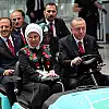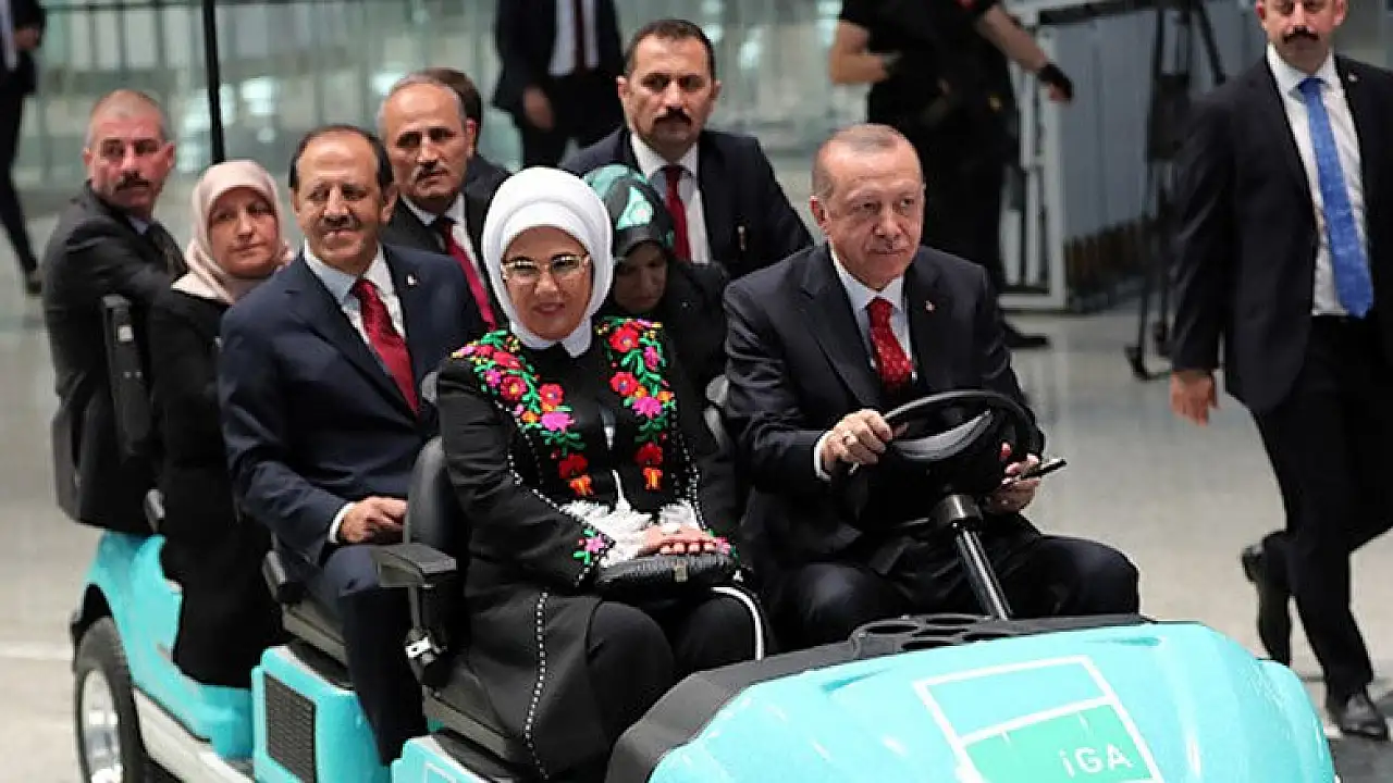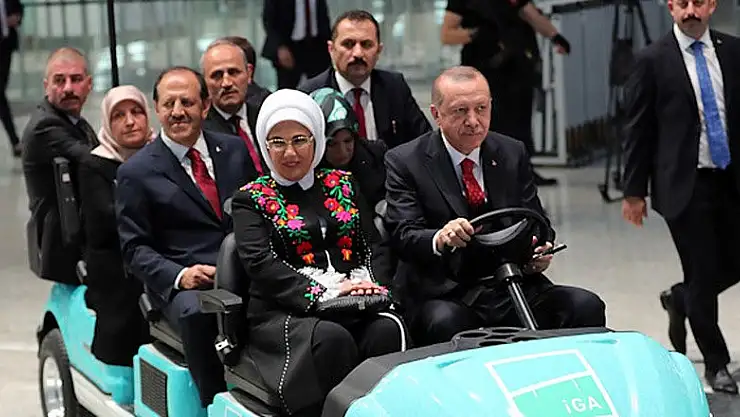 Cumhurbaşkanı Erdoğan, Yeni Havalimanı'nın içinde shuttle aracı kullandı. Erdoğan'ın yanında eşi Emine Erdoğan da vardı.