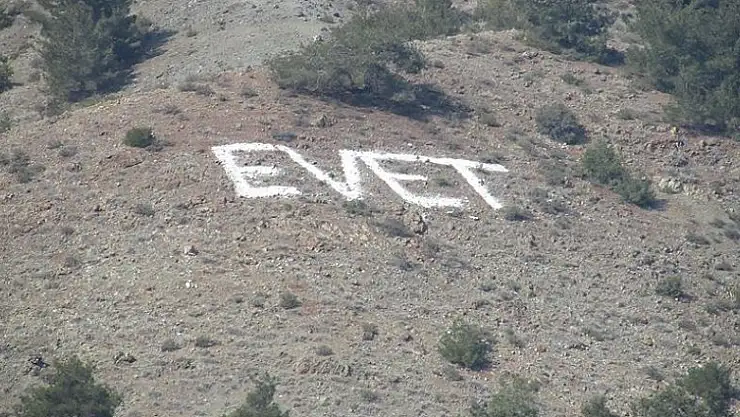 Gaziantep'in İslahiye ilçe belediyesinde çalışan işçiler, taş ve kireçle Değirmencik Dağı'na yazdıkları "Evet" ile Anayasa değişikliği referandumuna destek verdi.