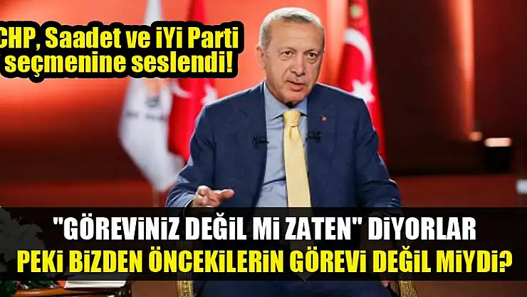 Cumhurbaşkanı Recep Tayyip Erdoğan, CHP, SP ve İYİ'ye gönül vermiş kardeşlerime sesleniyorum, 'yapacaksınız tabi göreviniz değil mi' diyor olabilirsiniz, peki bizden öncekiler neden yapmadı' ifadelerini kullandı.