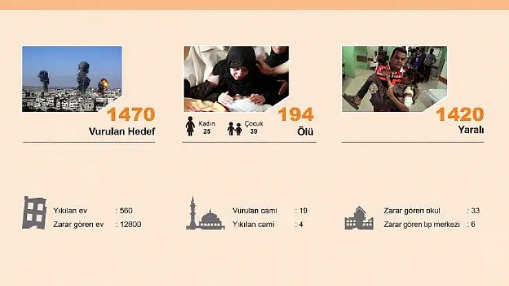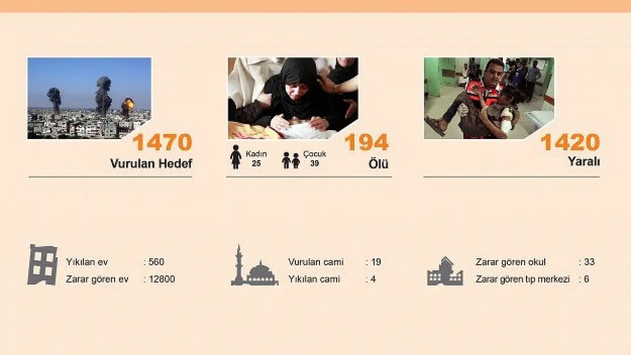Başbakan Erdoğan, 'Bugün saat 19.00'da elime gelmiş kesin ajans rakamları var. Bin 400 yaralı, 194 ölü, bin 470 İsrail'in vurduğu hedef. İsrail'in yaptıklarını neyle izah edeceğiz?' dedi.