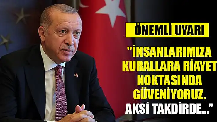 Mayıs ayı içinde faaliyetlerine yeniden başlamalarına izin verecekleri işletmelerle buralardan faydalanacak insanlara kurallara riayet noktasında güvendiklerini vurgulayan Erdoğan, "Aksi takdirde tedbirleri yeniden sıkılaştırmak zorunda kalabiliriz." dedi.