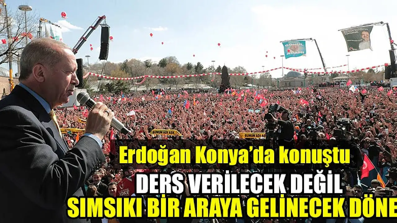"Eskiler 'Yitik kaybedildiği yerde bulunur' derler. Biz de inşallah Konya'da kaybettiğimizi Konya'da bulmakla işe başlayacak, bu ışığı dalga dalga tüm Türkiye sathına, tüm bölgemize, tüm dünyaya yayacağız. Tarihi konuşuyorum, tarihi değerlendiriyorum. Bunun için 31 Mart'ta sandığa iyi sahip çıkmamız gerekiyor. Birileri ülkemizin ve milletimizin içinden geçtiği kritik durumla asla ilgisi ve orantısı olmayan kimi gerekçelerle AK Parti'ye ders vermek istiyormuş ama unutmayalım ki dönem ders verilecek değil iki elin parmakları gibi sımsıkı bir araya gelinecek dönemdir."