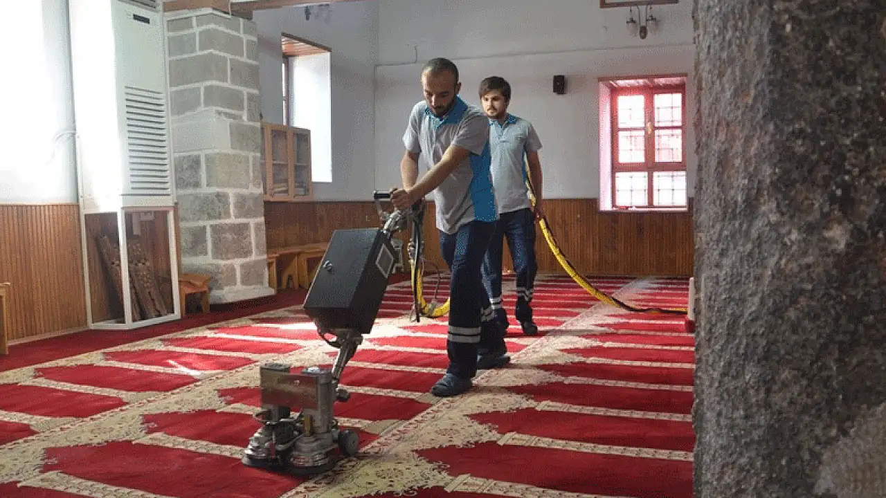 Konya'nın Ereğli İlçe Belediyesi özel ekipman ve araçlar ile camilerde bulunan halıları yıkıyor.