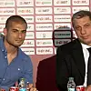 İmza töreni sonrası Levent Nazifoğlu ve Eren Derdiyok, 2019 yazılı forma ile basın mensuplarına poz verdi.