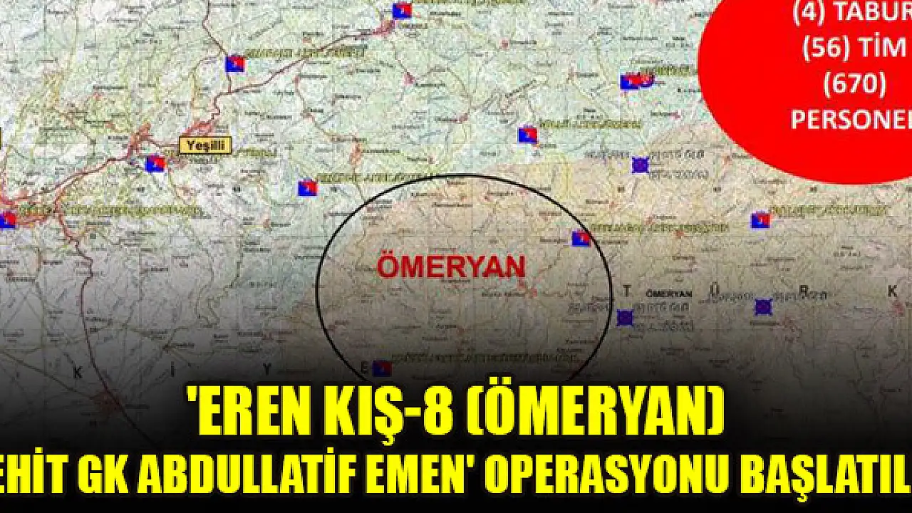 Bakanlıktan yapılan yazılı açıklamaya göre, PKK terör örgütünü ülke gündeminden çıkarmak ve bölgede barındığı değerlendirilen teröristleri etkisiz hale getirmek amacıyla Mardin'de 'Eren Kış-8 (Ömeryan) Şehit Güvenlik Korucusu Abdullatif Emen Operasyonu' başlatıldı. Operasyonda, Mardin İl Jandarma Komutanlığı sevk ve idaresinde; jandarma komando, jandarma özel harekat (JÖH) ve güvenlik korucusu timlerinden oluşan 670 personel görev alıyor. Yurt içinde terörün tamamen ortadan kaldırılmasına yönelik yürütülen 'Eren' kış operasyonlarının, halkın desteğiyle inançlı ve kararlı olarak başarıyla devam ettiği belirtildi.