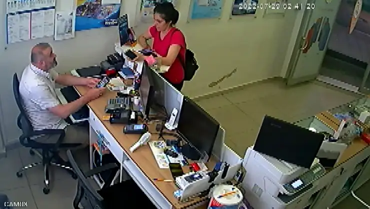 Güvenlik kamerasındaki görüntülerde şüpheli kadının müşteri gibi geldiği, elindeki iki cep telefonundan birini iş yeri sahibine uzattıktan sonra, masaya doğru yaklaştığı dikkat çekiyor. Sürekli konuşarak iş yeri sahibinin dikkatini dağıtan şüpheli, elindeki diğer telefonu göstererek kırılmaz cam taktırmak istediğini söylüyor. Bu sırada masa üzerindeki cep telefonunu almak için hamle yapan kadın, iş yeri sahibinin masadan uzaklaşması için bir süre bekliyor. İş yeri sahibi masadan kalkıp arkasını arkasını dönerken masada bulunan cep telefonunu alan şüpheli, elindeki diğer iki telefonun arasında saklıyor. Kadının bir süre daha konuşarak, dikkat çekmeden iş yerinden çıkıyor.