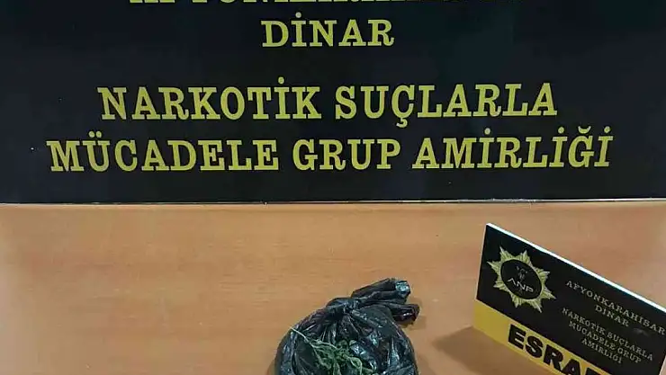 Olay, Başmakçı ilçe merkezinde meydana geldi. Edinilen bilgilere göre, Dinar İlçe Emniyet Müdürlüğüne bağlı Dinar Narkotik Suçlarla Mücadele ekipleri Başmakçı ilçesinde A.A., isimli bir şahsı takibe aldı. Bir süre izleme yapan ekipler ardından şahsı gözaltına aldı. Şahsın yapılan üst aramasında 14 gram esrar ele geçirdi. Gözaltına alınan şahıs hakkında uyuşturucu madde kullanımından işlem yapıldı.