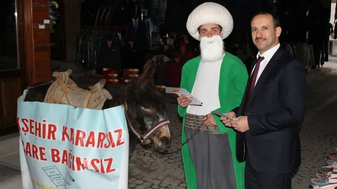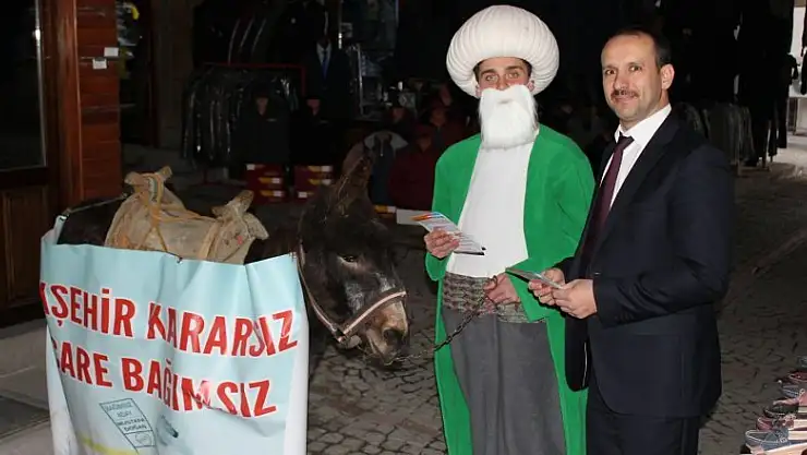 Akşehir'de Bağımsız Belediye Başkan adayı Mustafa Doğan seçim yarışında eşşeğiyle sokak sokak gezip vatandaşlardan oy istiyor.