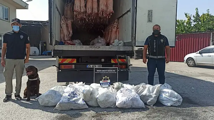 Mersin'de narkotik polisinin durdurduğu et yüklü kamyonda çuvallar içerisinde 77 kilo esrar ele geçirildi, 3 kişi gözaltına alındı.