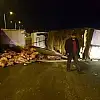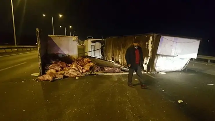Etlerin başka bir araca yüklenmesi ve TIR'ın vinçle kaldırılmasının ardından trafik normale döndü.