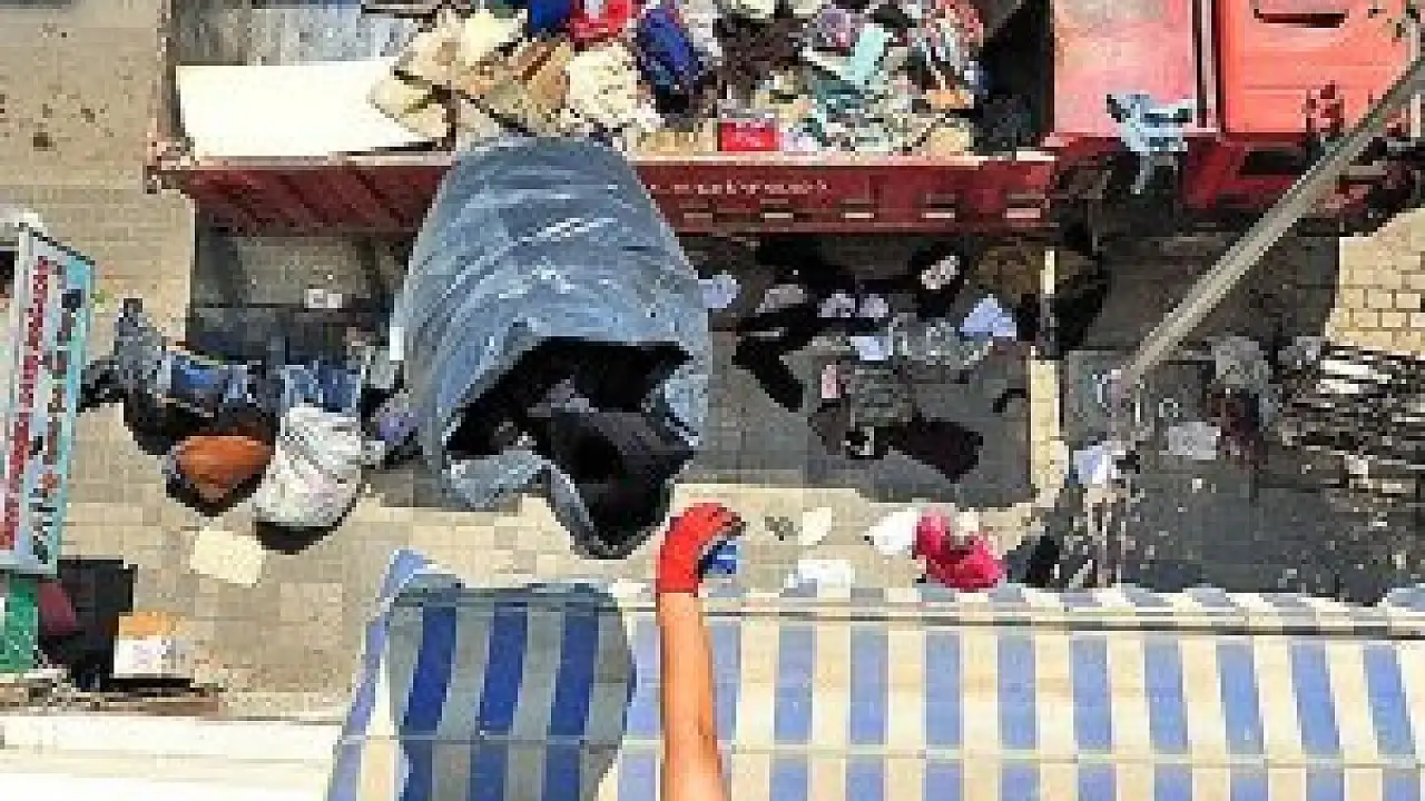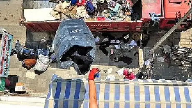 Binanın 3'üncü katı ve teras bölümü ile merdiven boşluklarındaki çöpler, belediyeye bağlı 10 personel tarafından kamyonlara yüklendikten sonra götürüldü.