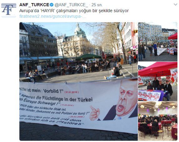 Terör örgütü PKK'nın yayın organı ANF, Avrupa'nın 'hayır' cephesine verdiği desteği Twitter hesabından böyle duyurdu;