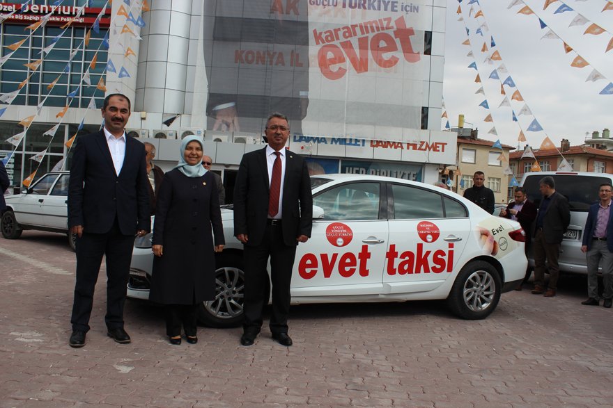 AK Parti Karatay İlçe Teşkilatı tarafından hayata geçirilen “Evet Taksi Yollarda” projesi AK Parti Konya İl Başkanlığı önünde AK Parti Konya Milletvekili Hüsniye Erdoğan, Karatay Belediye Başkanı Mehmet Hançerli ve AK Parti Karatay İlçe Başkanı Mehmet Genç’in katıldığı basın toplantısı ile kamuoyuna duyuruldu.