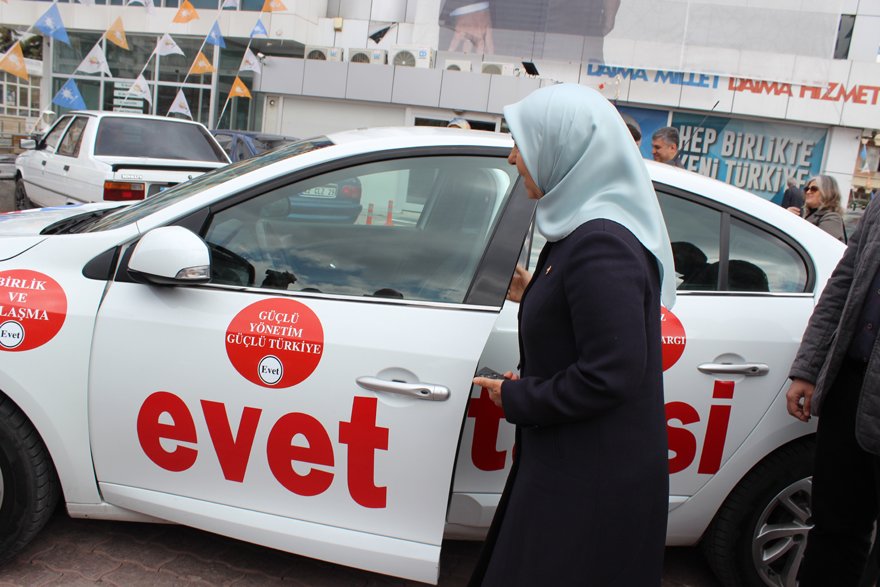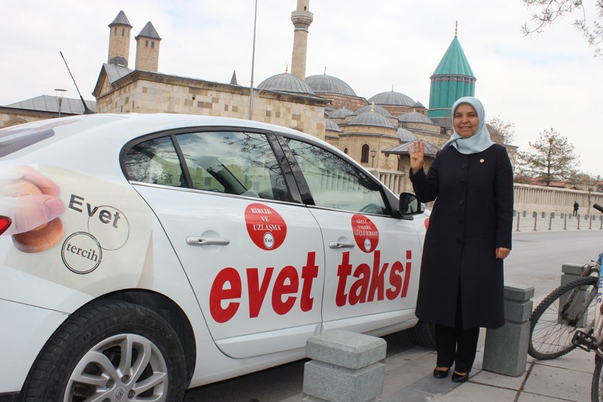 AK Parti Karatay İlçe Teşkilatı tarafından hayata geçirilen Evet Taksi Yollar'da Projesi'nin tanıtımı AK Parti Konya İl Başkanlığı önünde gerçekleştirildi. Proje'nin ilk seferi için de direksiyona AK Parti Konya Milletvekili Hüsniye Erdoğan geçti.