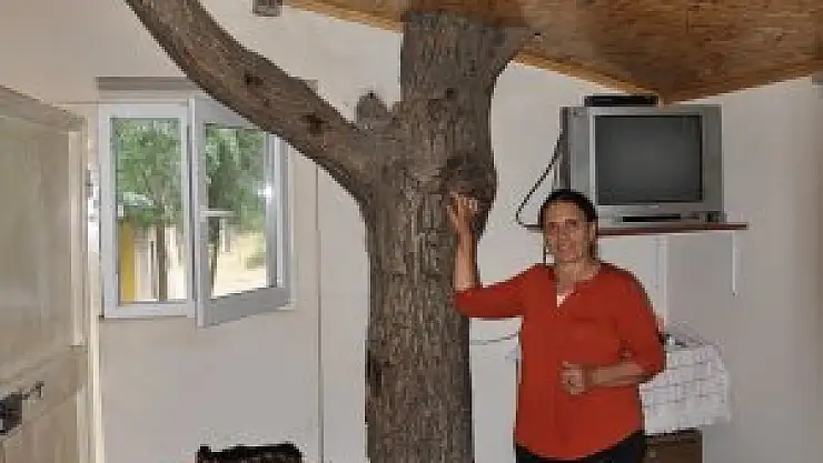 Tuncelili Gülizar Uçan'ın, arsasına ev yaptırırken kesmeye kıyamadığı ceviz ağacının gövdesi odanın içinde kaldı- Uçan:- 'Ağaca zarar vermeden evi yaptırdık. Dallarını bile kesmedik, çatıdan dışarı çıkardık. Hem gölgesinden yararlanıyoruz hem görünüşü güz