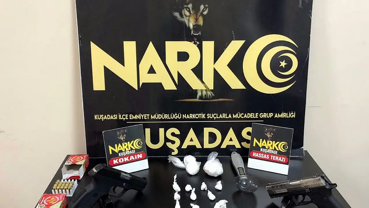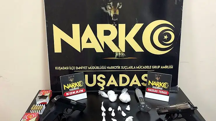 Aydın'n Kuşadası ilçesinde, polisin baskın düzenlediği evde buzdolabında ve giriş kapısının üzerindeki asma tavana gizlenmiş 61,95 gram kokain ile 1'i komodinde diğeri ise motosikletinin sele kısmında ruhsatsız 2 tabanca ele geçirildi. Ev sahibi B.S. gözaltına alındı.Kuşadası İlçe Emniyet Müdürlüğü Narkotik Suçlarla Mücadele ve Kaçakçılıkla Mücadele Grup Amirliği ekipleri, istihbarat çalışmasıyla B.S.'nin evinde uyuşturucu bulunduğunu belirledi. B.S.'nin Türkmen Mahallesi'ndeki evine operasyon düzenlendi. Evde yapılan aramada buzdolabında ve giriş kapısının üzerindeki asma tavana gizlenmiş satışa hazır 13 parça halinde toplam 61,95 gram kokain ve 1 hassas terazi, komodinde ruhsatsız bir tabanca ele geçirildi. B.S.'nin evinin önündeki motosikletindeki aramada ise selenin altında ruhsatsız tabanca ile 41 mermi bulundu. B.S., gözaltına alındı. B.S.'nin polisteki işlemlerinin sürdüğü bildirildi.