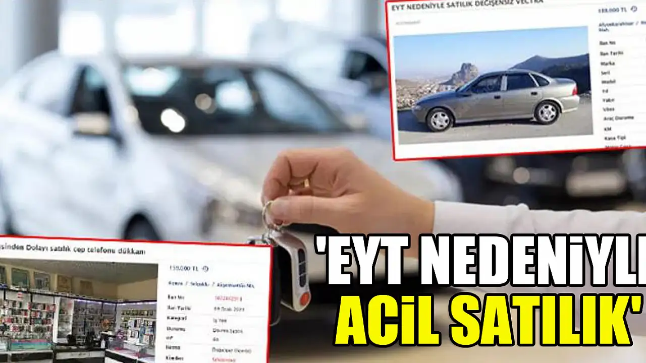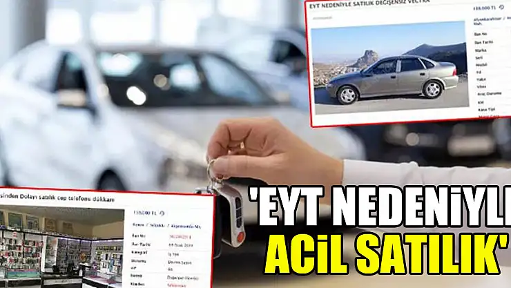 Türkiye'nin birçok ilinden ilan veren EYT'lilerden biri, Aydın Yenipazar'da 456 metrekarelik arsasını 320 bin TL'ye satışa çıkardı. İlanda "EYT'den dolayı 450 metrekarelik arsamı satıyorum" açıklaması bulunuyor. Konya Selçuklu'da bir kişi ise "EYT ödemesinden dolayı satılık cep telefonu dükkanı" şeklinde verdiği ilan ile 60 metrekarelik dükkanını 159 bin TL'ye satışa çıkardı. Afyonkarahisar'dan bir EYT'li, 1999 model aracını EYT nedeniyle satılığa çıkardığını belirttiği ilanda, 188 bin TL talep ediyor. İstanbul'dan bir EYT'li de 2011 model aracı için 189 bin TL istiyor. Bir satış sitesinde EYT nedenli 11 emlak, 56 araç, 3 ev aletleri ve 1 tarım makinası ilanı bulunuyor. (DHA)